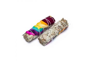 Weißes Salbei Bündel mit Rosenblättern in den Farben der sieben Chakren